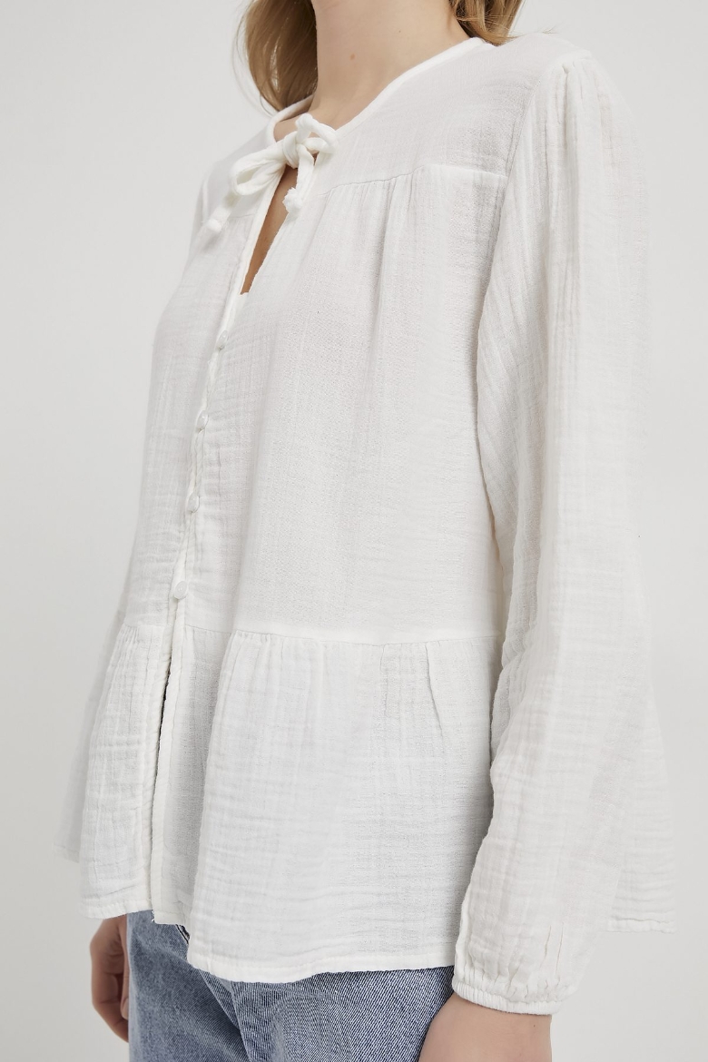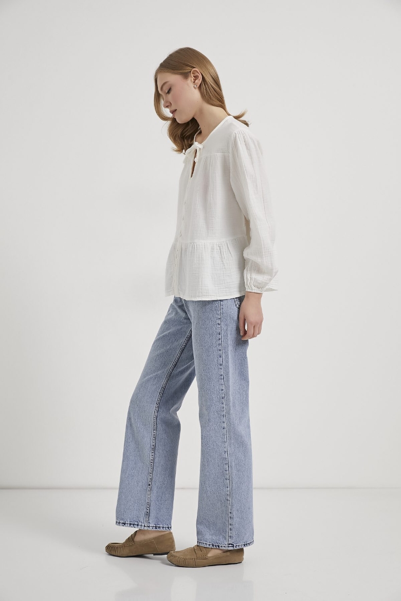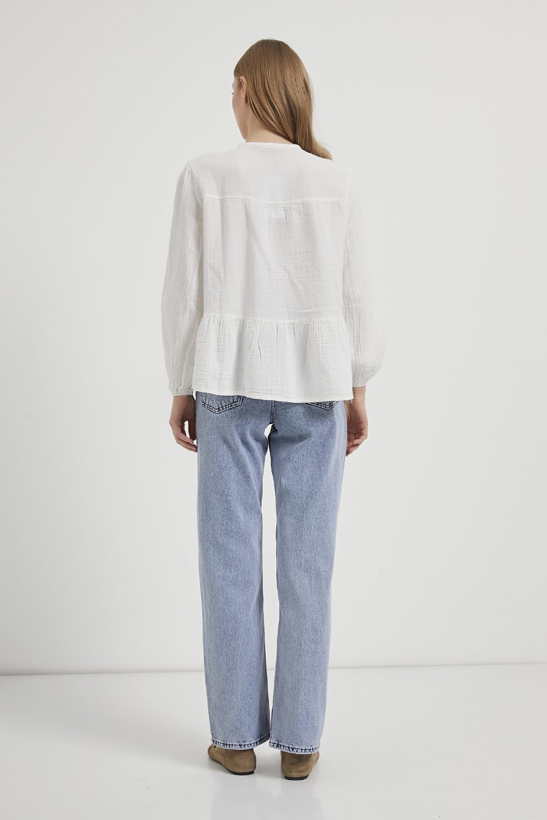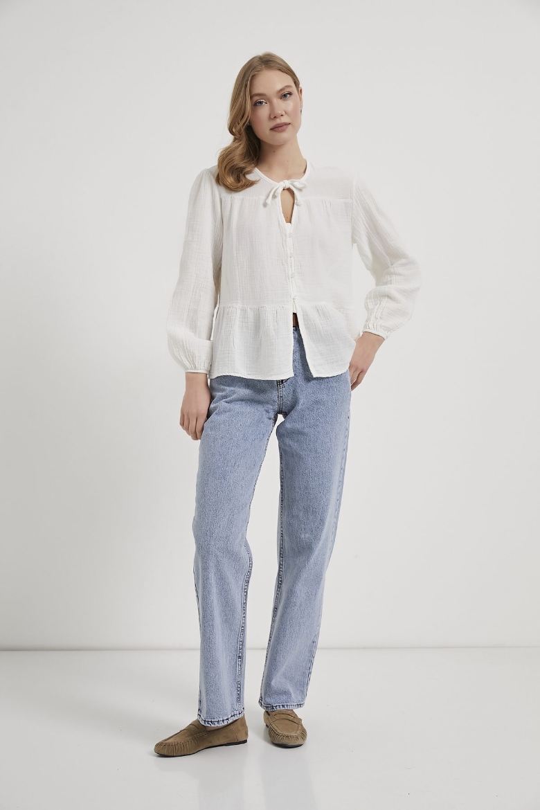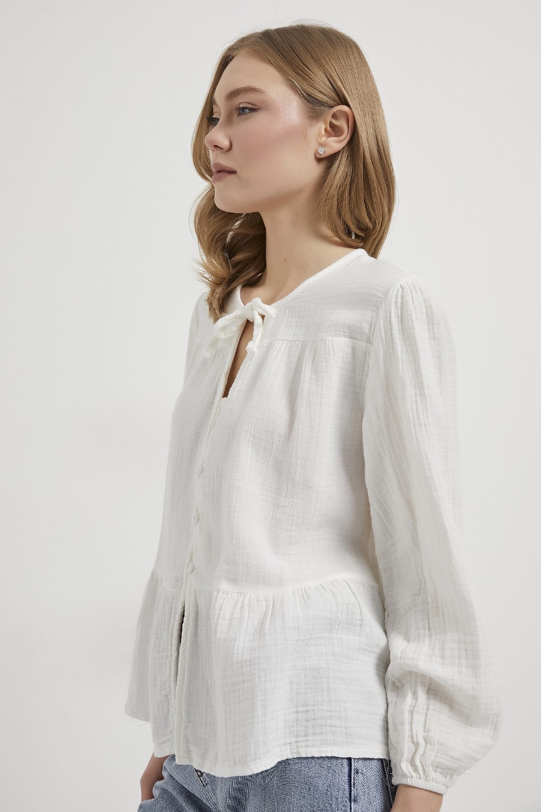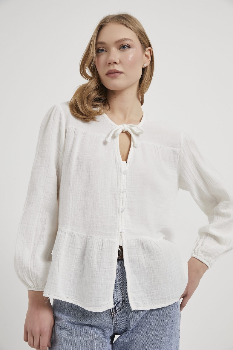 ARMALIFE 0437 BAĞLAMA DETAY KOLU LASTİKLİ DÜĞMELİ MÜSLİN KADIN BLUZ