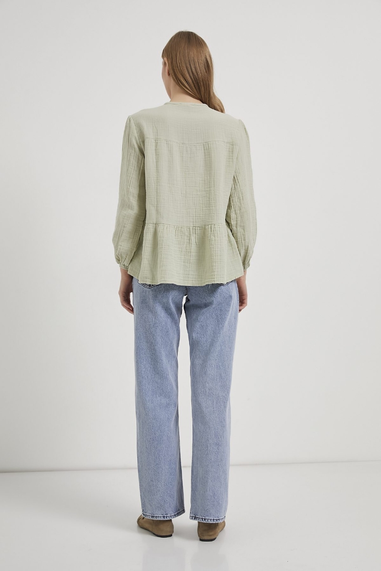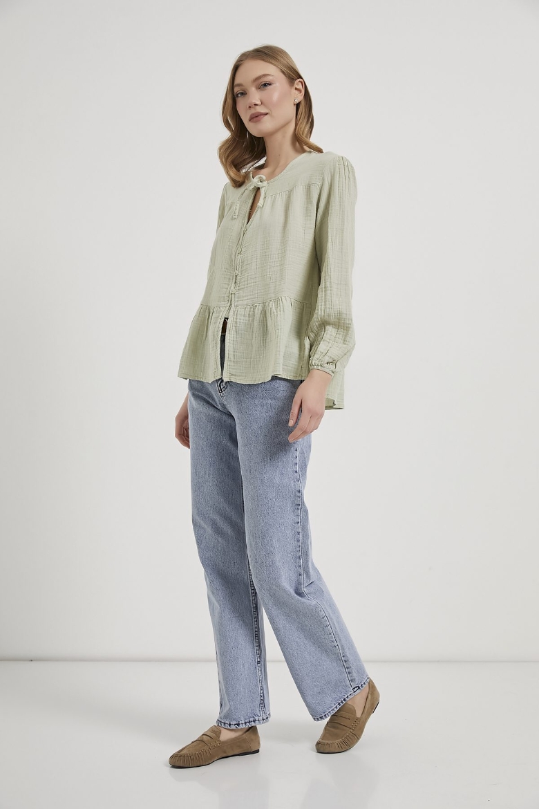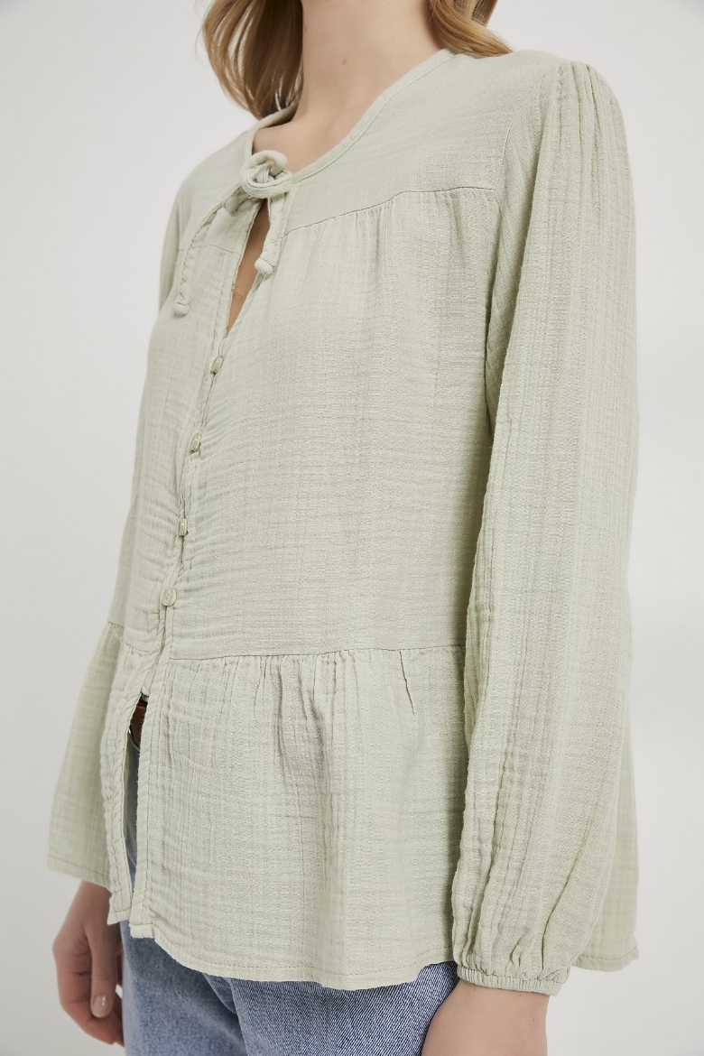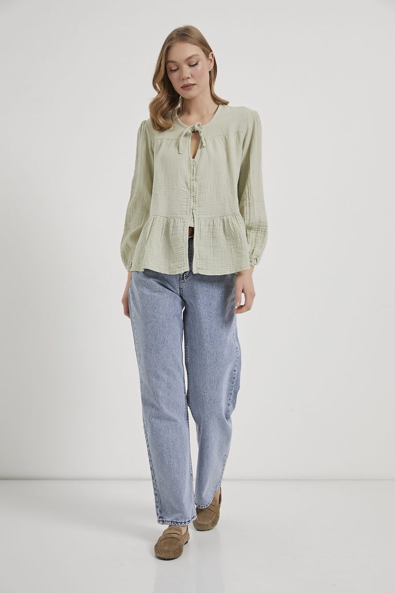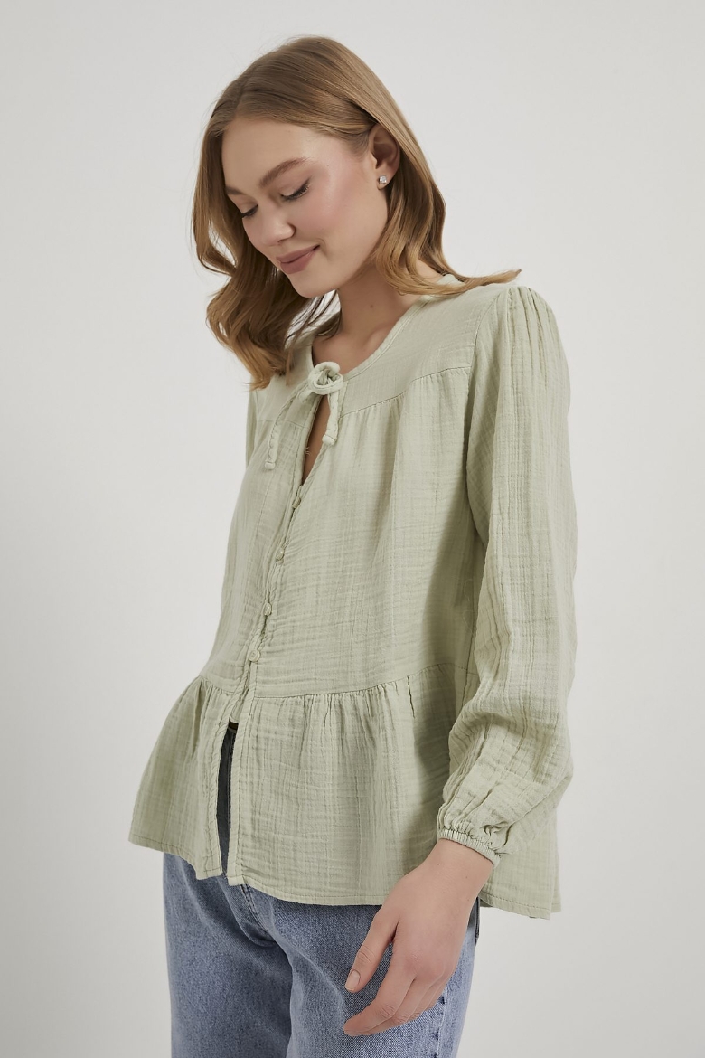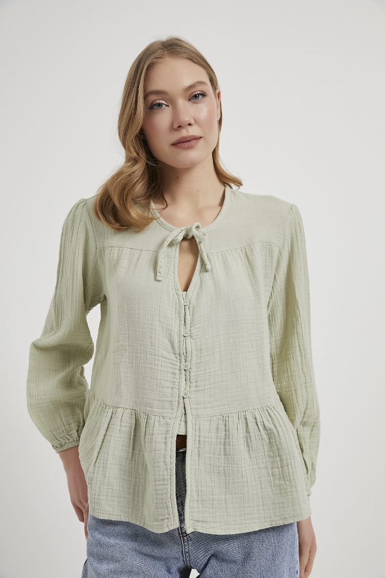 ARMALIFE 0437 BAĞLAMA DETAY KOLU LASTİKLİ DÜĞMELİ MÜSLİN KADIN BLUZ