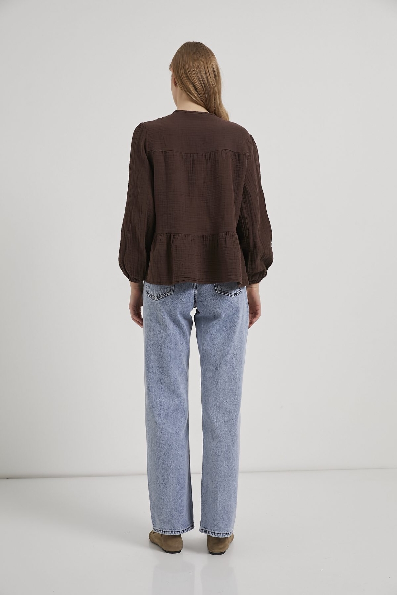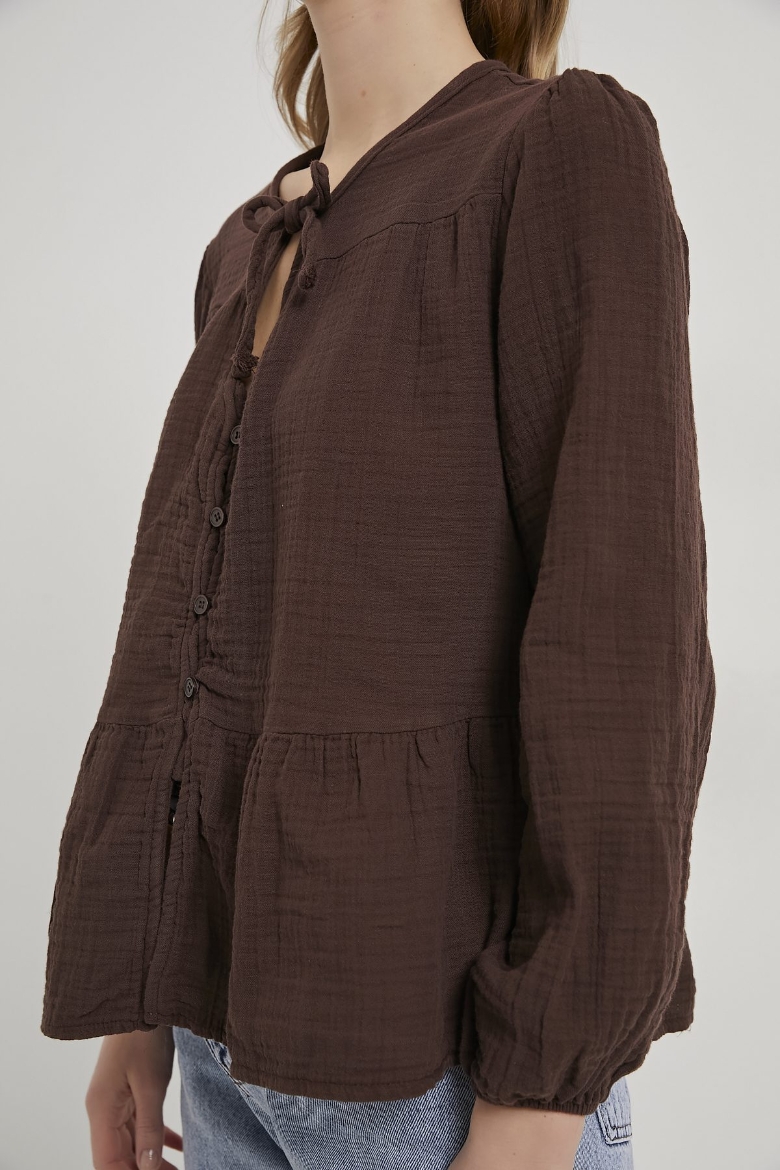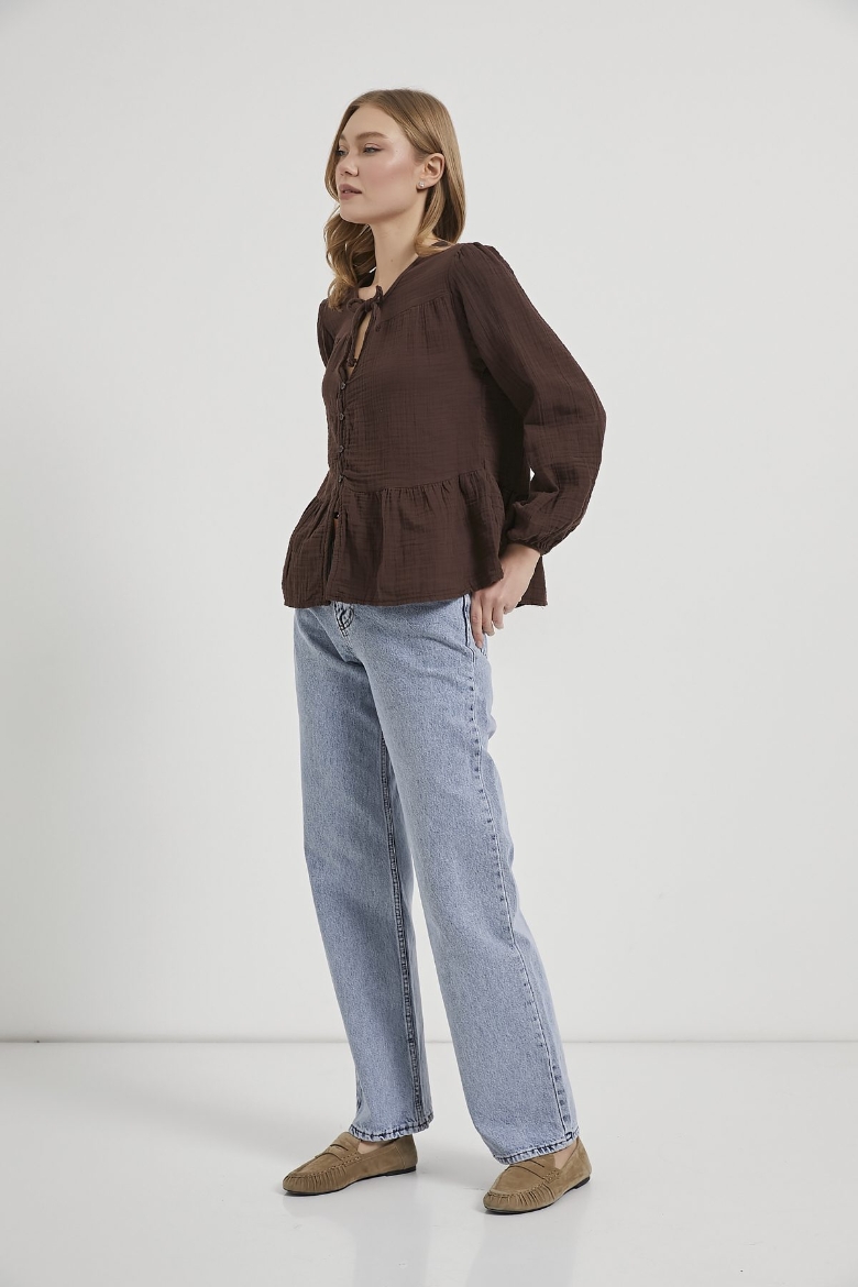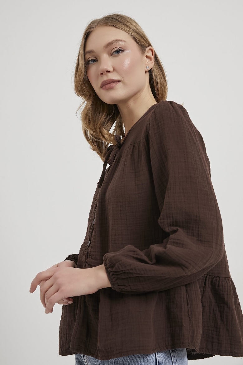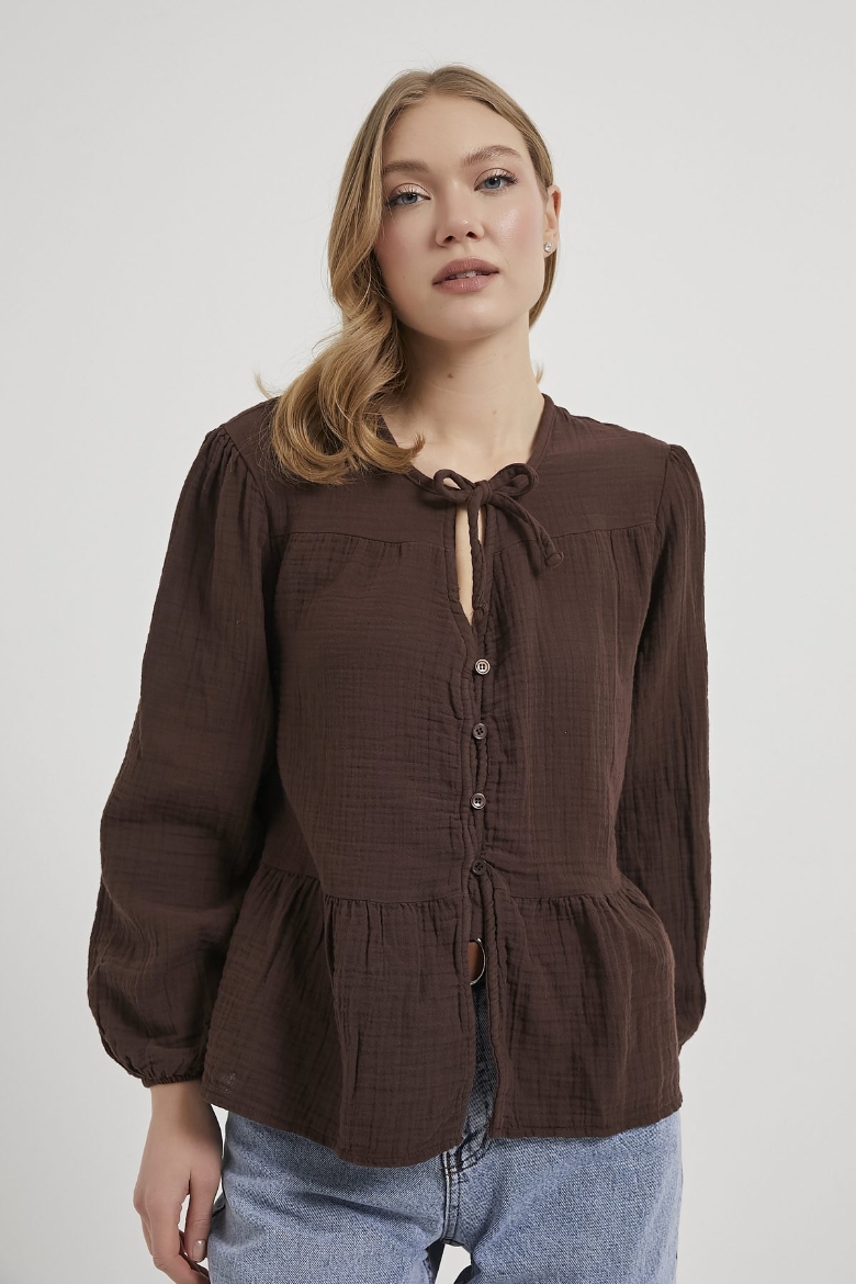 ARMALIFE 0437 BAĞLAMA DETAY KOLU LASTİKLİ DÜĞMELİ MÜSLİN KADIN BLUZ
