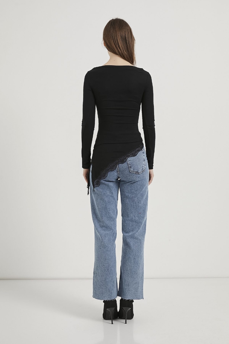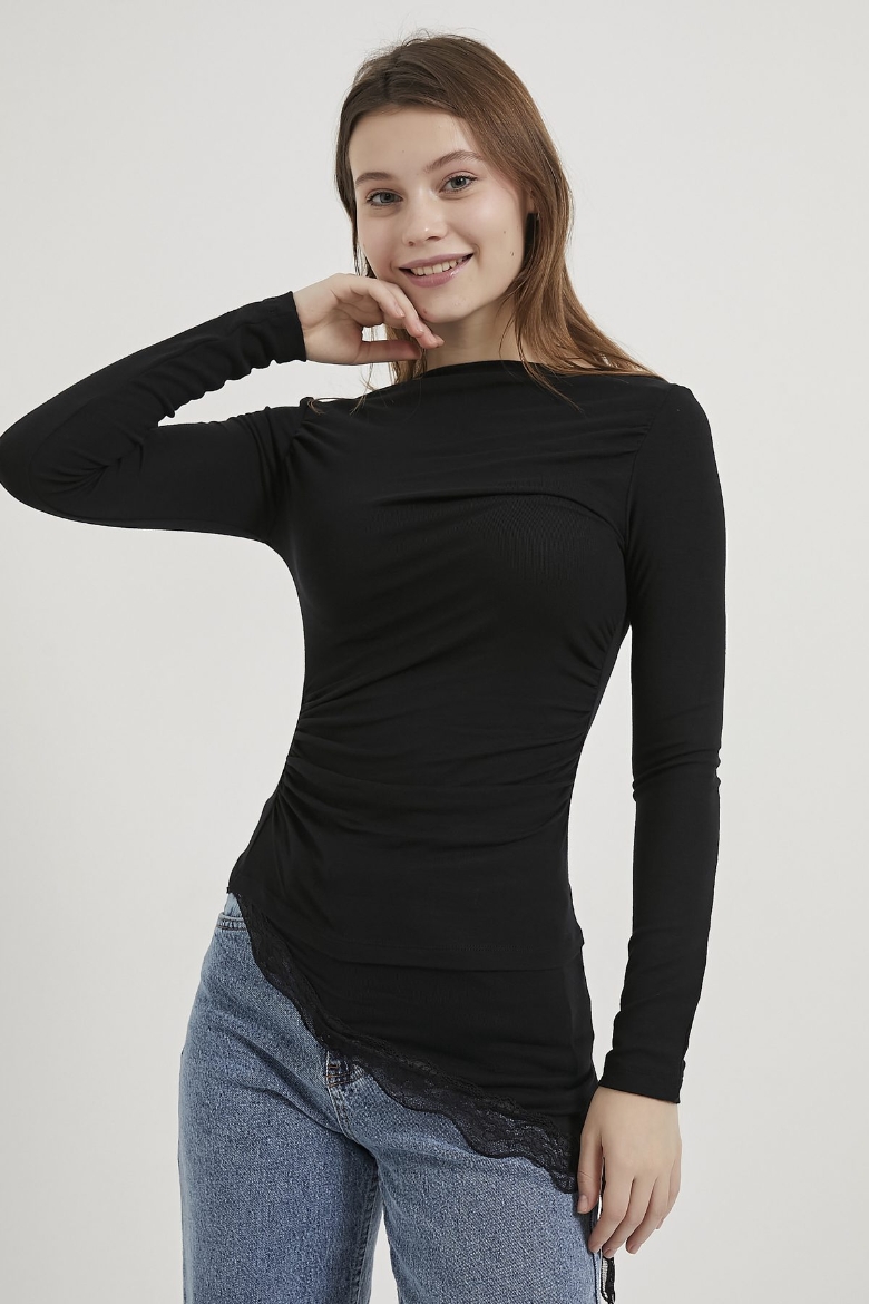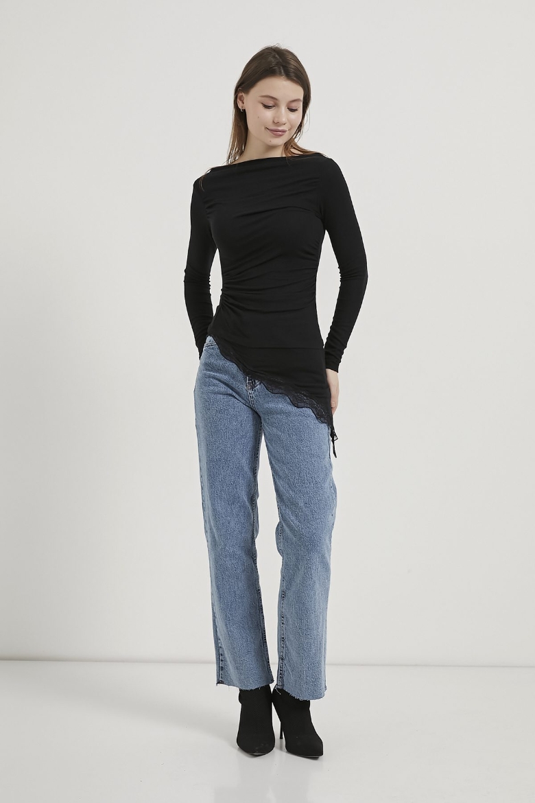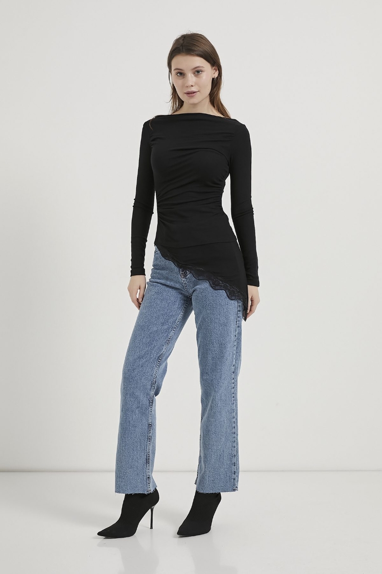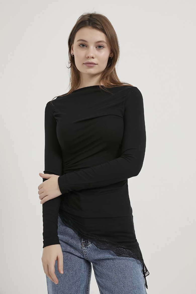 ARMALIFE 10532 KAYIK YAKA DANTEL DETAYLI ETEĞİ ASİMETRİK KADIN BLUZ
