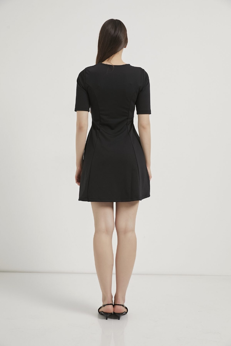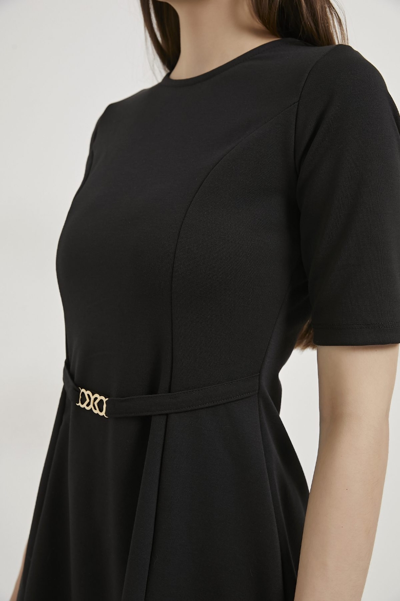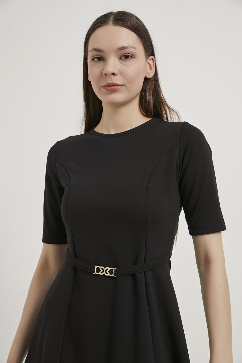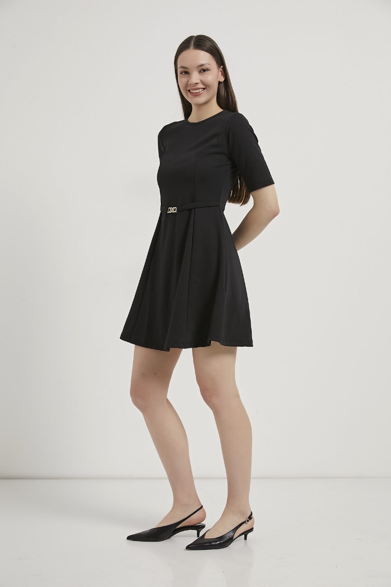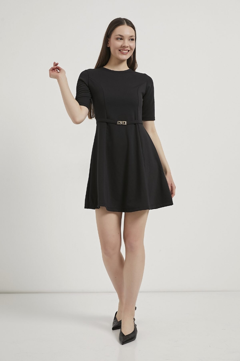 ARMALIFE 1102 BELİ KEMERLİ AKSESUAR DETAYLI BİS YAKA KISA KOL MİNİ KADIN ELBİSE