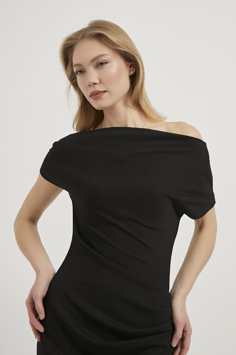 ARMALIFE 11174 DÜŞÜK OMUZ BÜZGÜ DETAY MİNİ KADIN ELBİSE