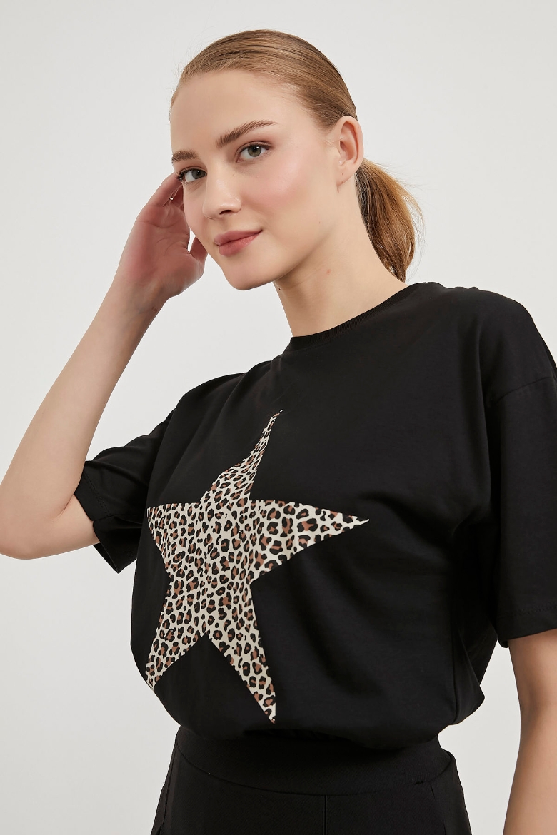 ARMALIFE 1306 YILDIZ LEOPAR BASKILI BİS YAKA KADIN T-SHIRT