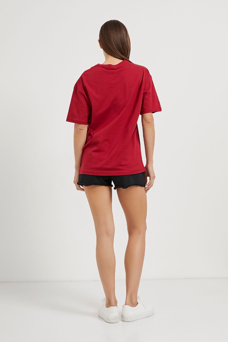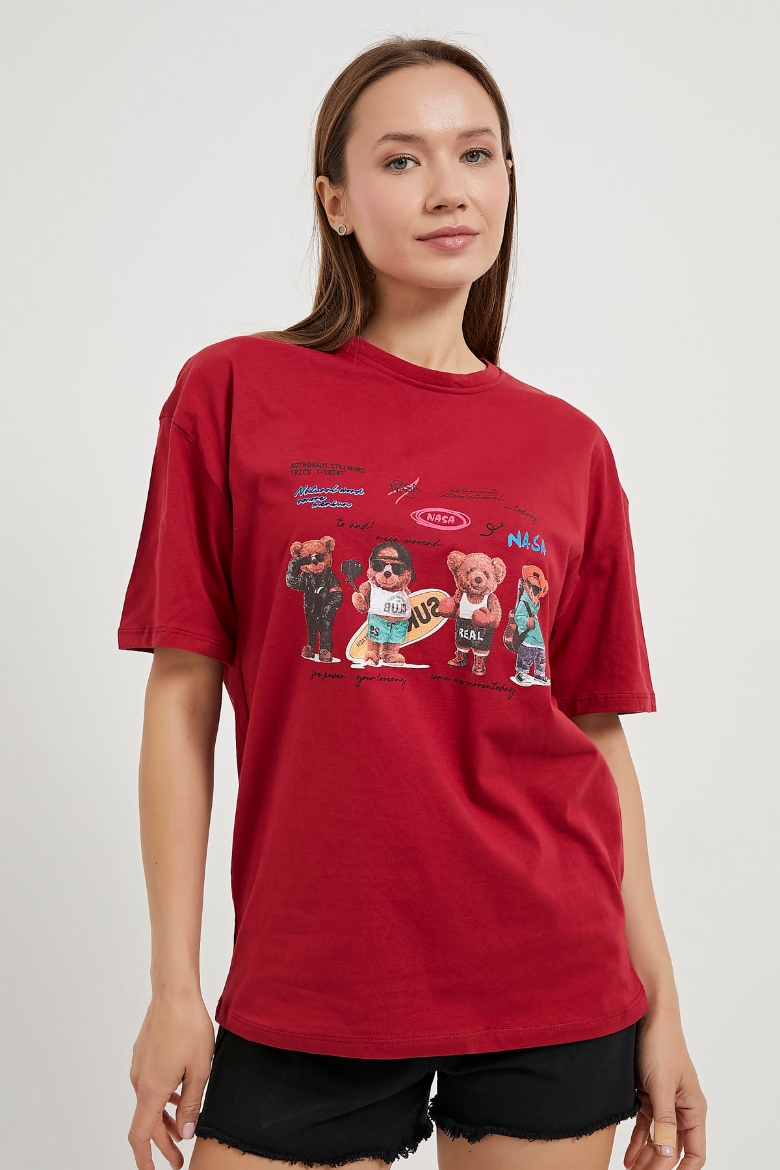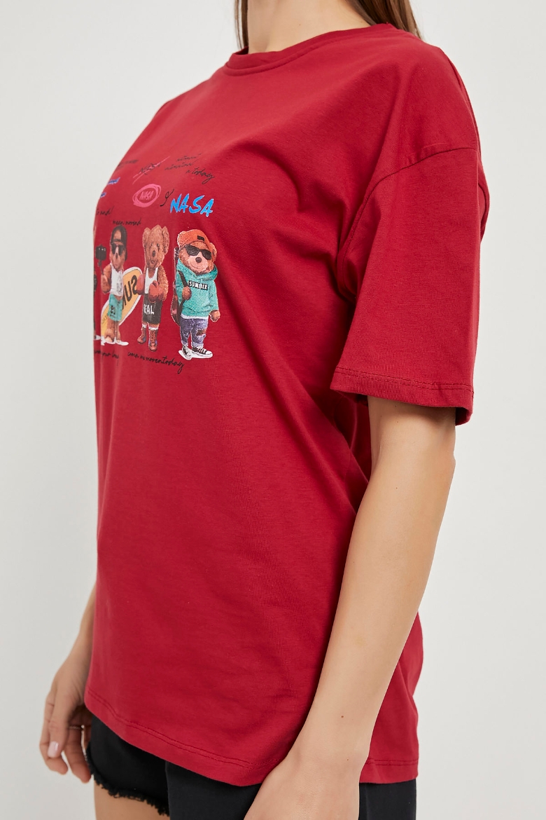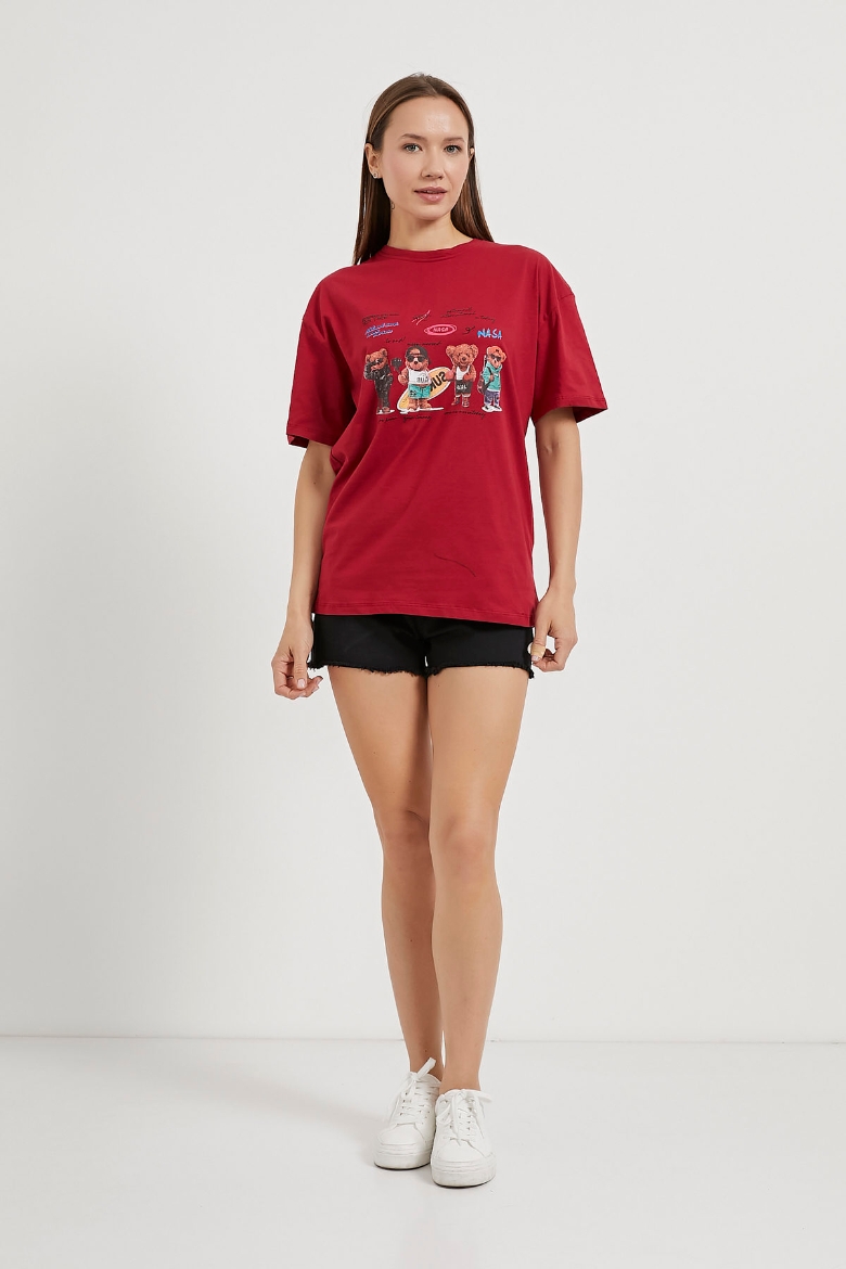 ARMALIFE 2104 AYICIK TEMALI ÖN BASKILI BİS YAKA OVERSIZE KADIN T-SHIRT