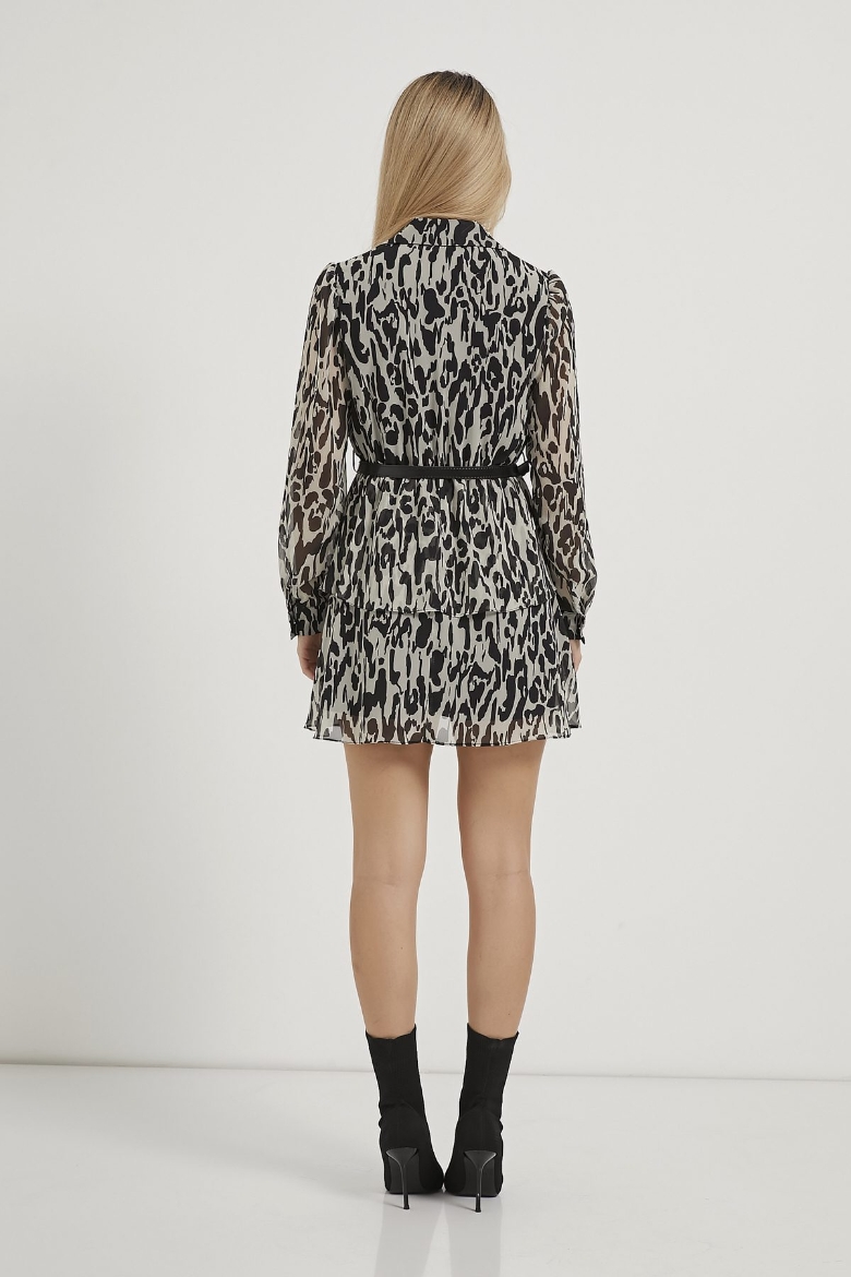 ARMALIFE 7962 DESENLİ KEMER DETAYLI GÖMLEK YAKA ŞİFON MİNİ KADIN ELBİSE