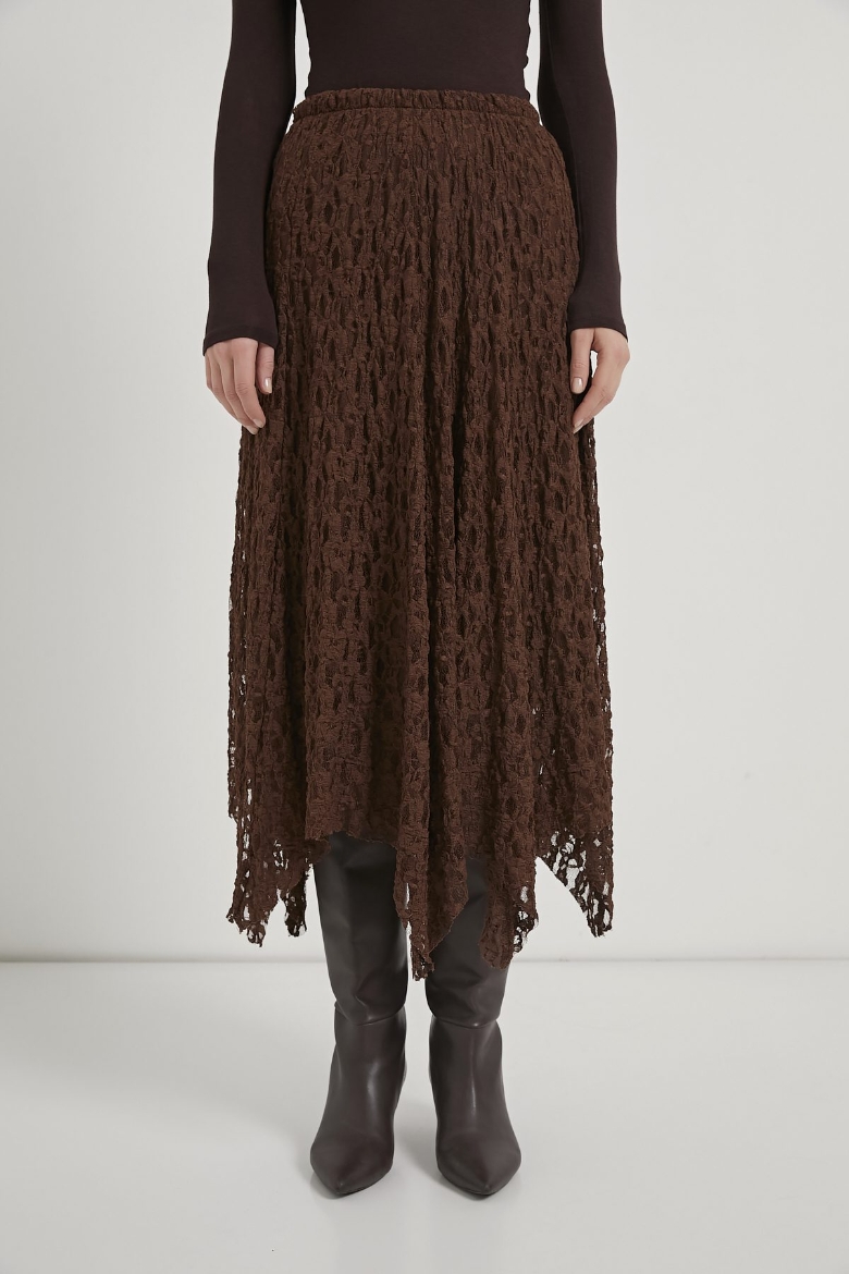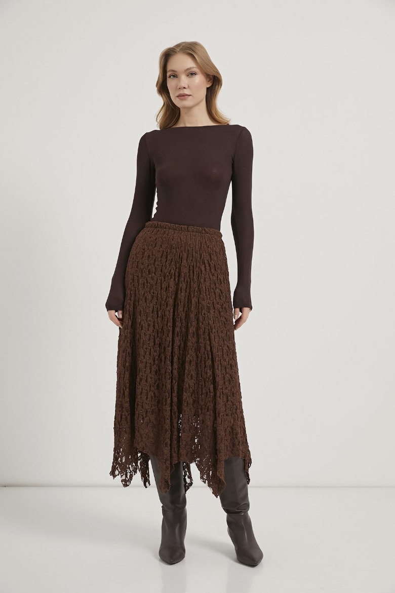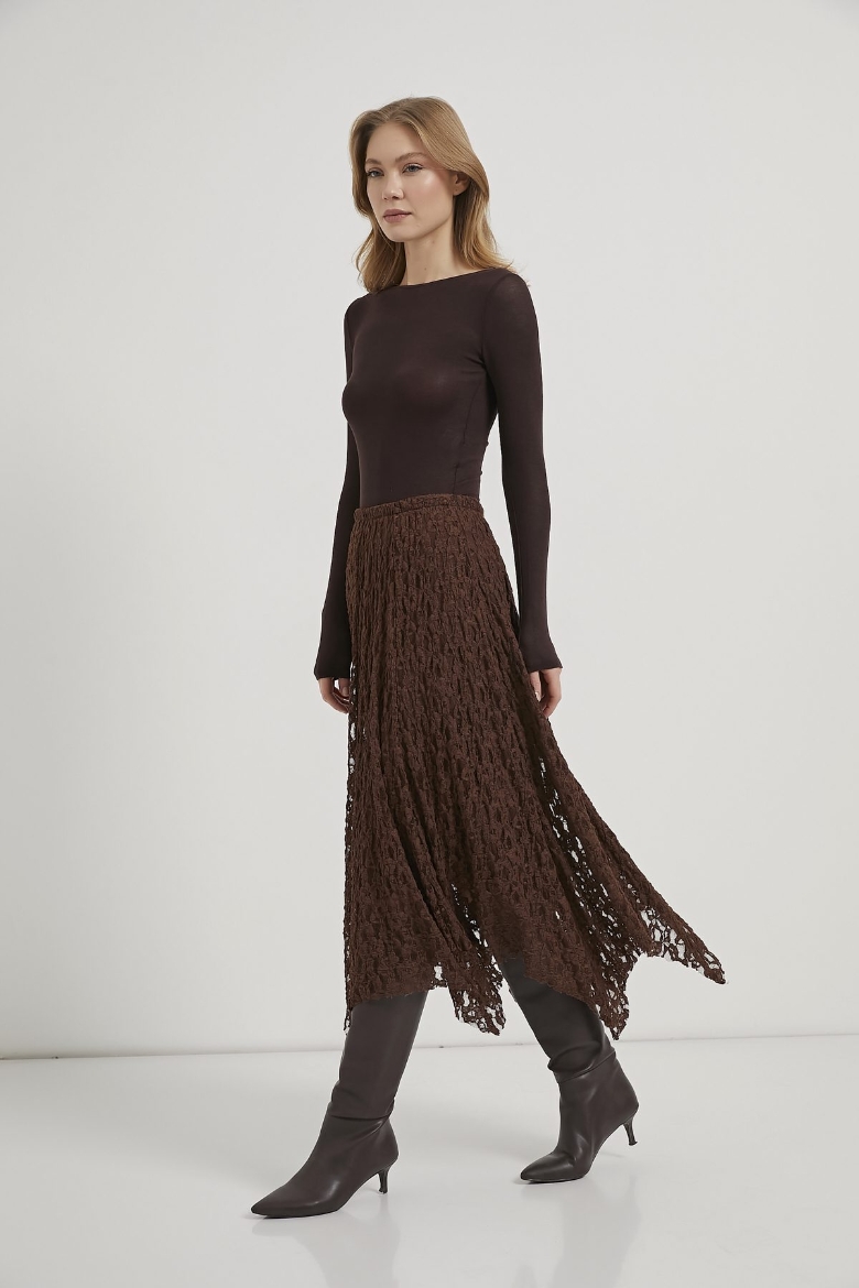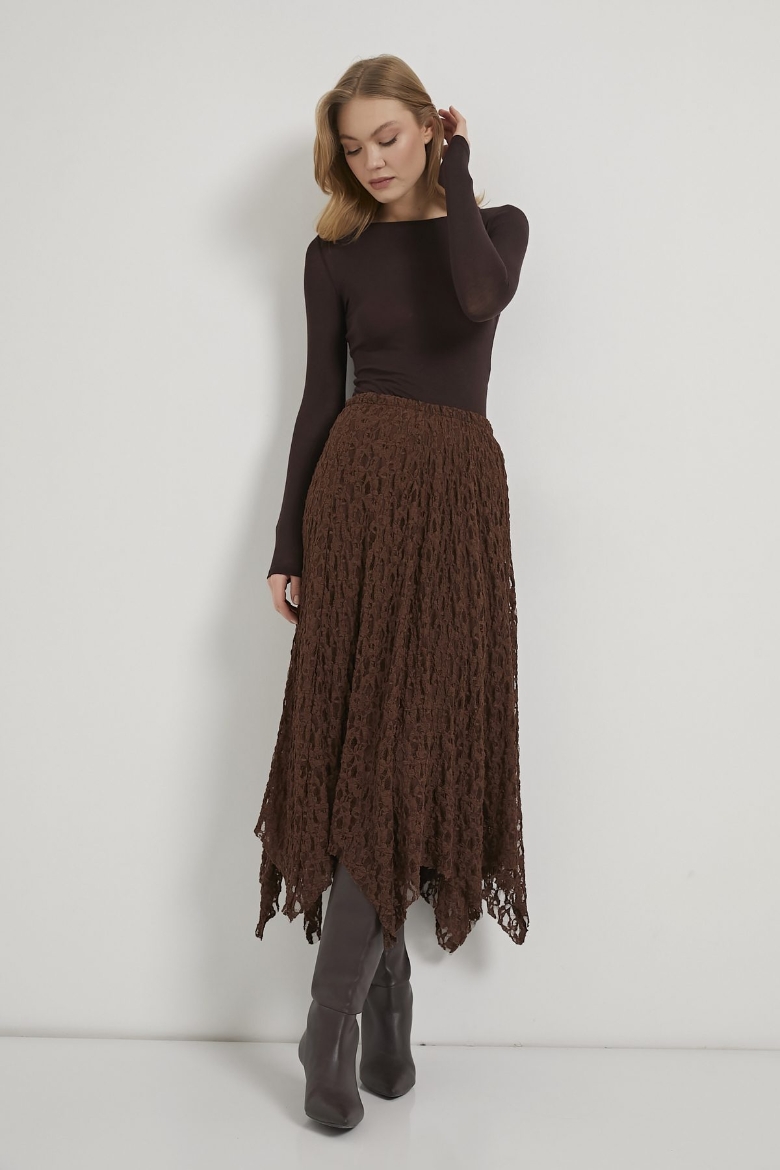 ARMALIFE 8507 ASİMETRİK BELİ LASTİKLİ ASTARLI MİDİ DANTEL KADIN ETEK