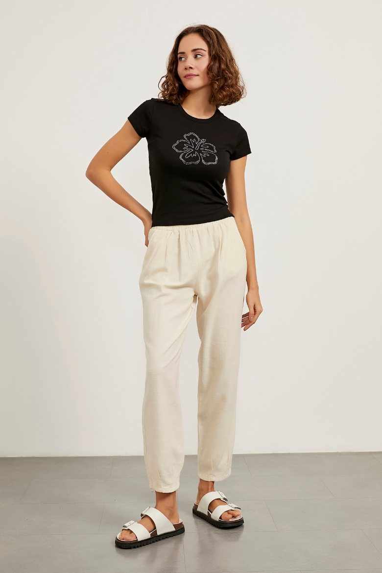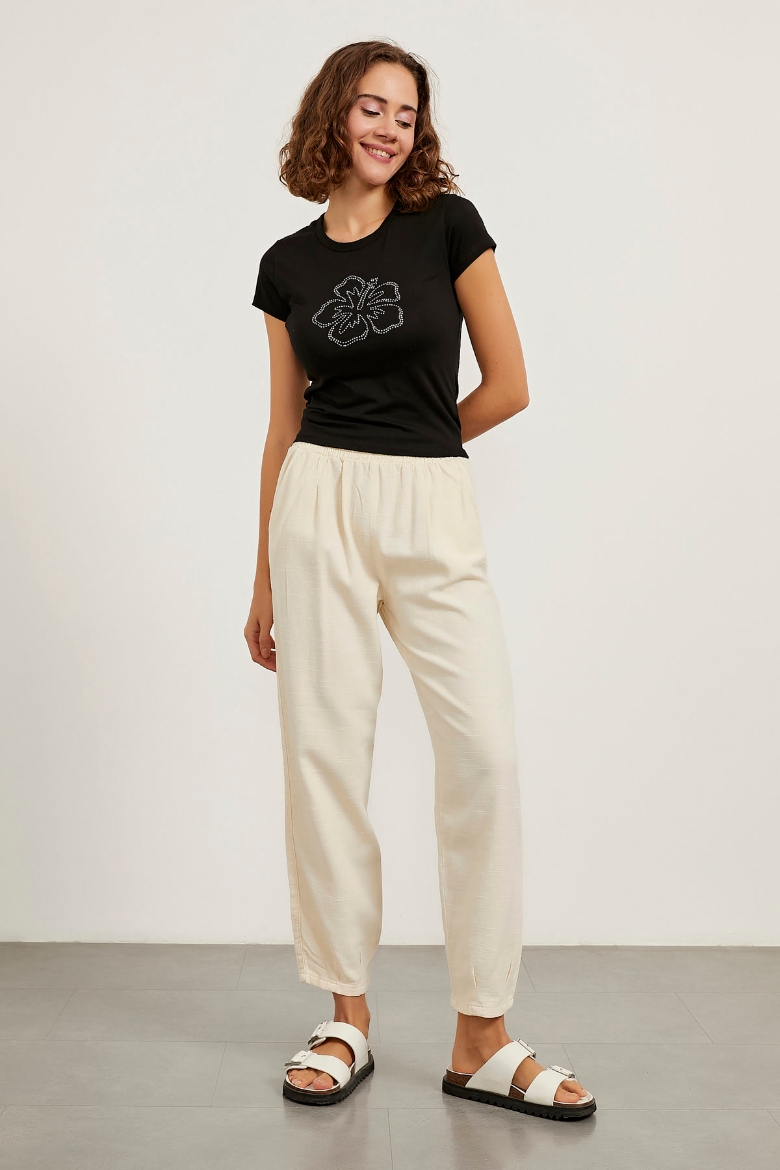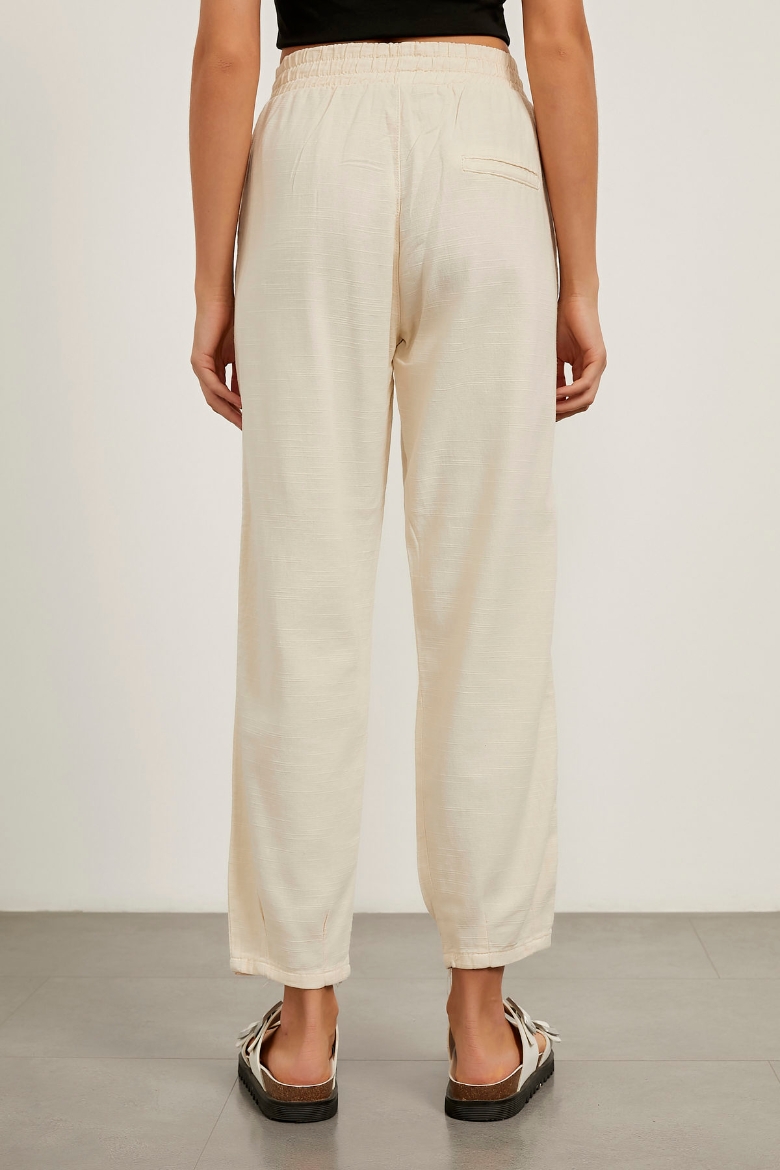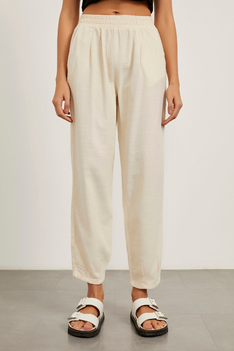 Bel Lastikli Keten Dokulu Pantolon
