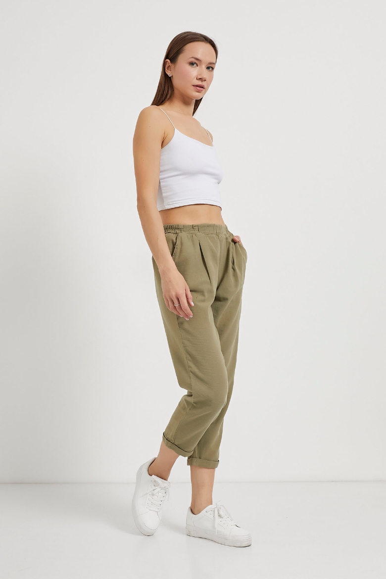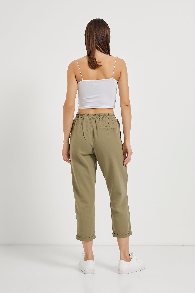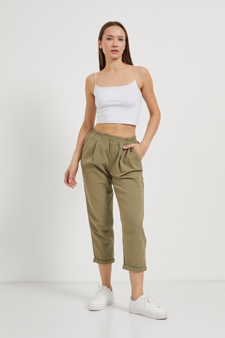 Önü Patlı Bel Lastikli Keten Havuç Pantolon